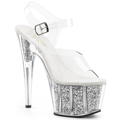Style Name: ADORE-708G Footwear Style: Platform Shoes Heel Height: 7 Inch (17.8cm) Platform Height: 2.8 Inch (7 cm) Colour: Clear/Silver Multi Glitter Inserts Brand: Pleaser SKU: ADO708G/C/SGI Range: 7" Heel and a 2 3/4" Platform Fitting: TRUE TO SIZE Material: PVC Uppers, MICROFIBER Mid sole, N/A Lining Material, RUBBER Outer sole Brief Description: 7" Heel, 2 3/4" PF Ankle Strap Sandal w/ Glitter Inserts HS Code: 6402.99.3165 Common Search terms : ADORE-708G, ADORE 708G, ADO708G/C/SGI, ADORE708G and Pleasers