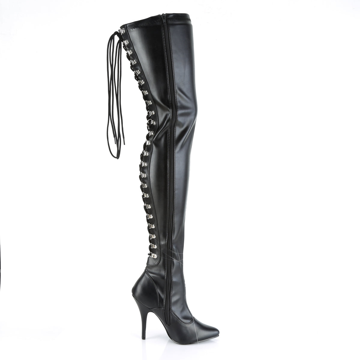 Description: 5" (12.7cm) Heel Open Back D-Ring Stretch Thigh Boot, Full Inner Side Zip Closure