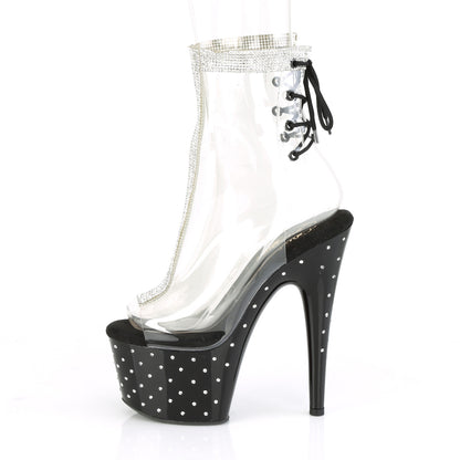 STARDUST-1018C-2RS Pleaser Clear/Black Sexy Platform Shoes (Pole Dancing Heels) - Pleaser STARDUST-1018C-2RS Pleaser Heels Platform Shoes with a 7 Inch Heel and a 2 3/4 Inch Platform, Pleaser Shoes Ankle/Mid-Calf Boots Platform Shoes Pleasers made by Pleaser Shoes. These Pleaser heels have a 7 Inch Heel (17.8cms), and the platform is 2.8 Inches (7cm). These STARDUST-1018C-2RS Pleasers Sexy Footwear Platform Shoes are, Clear/Black in colour and are a perfect addition to any Pole Dancing Footwear Collection.